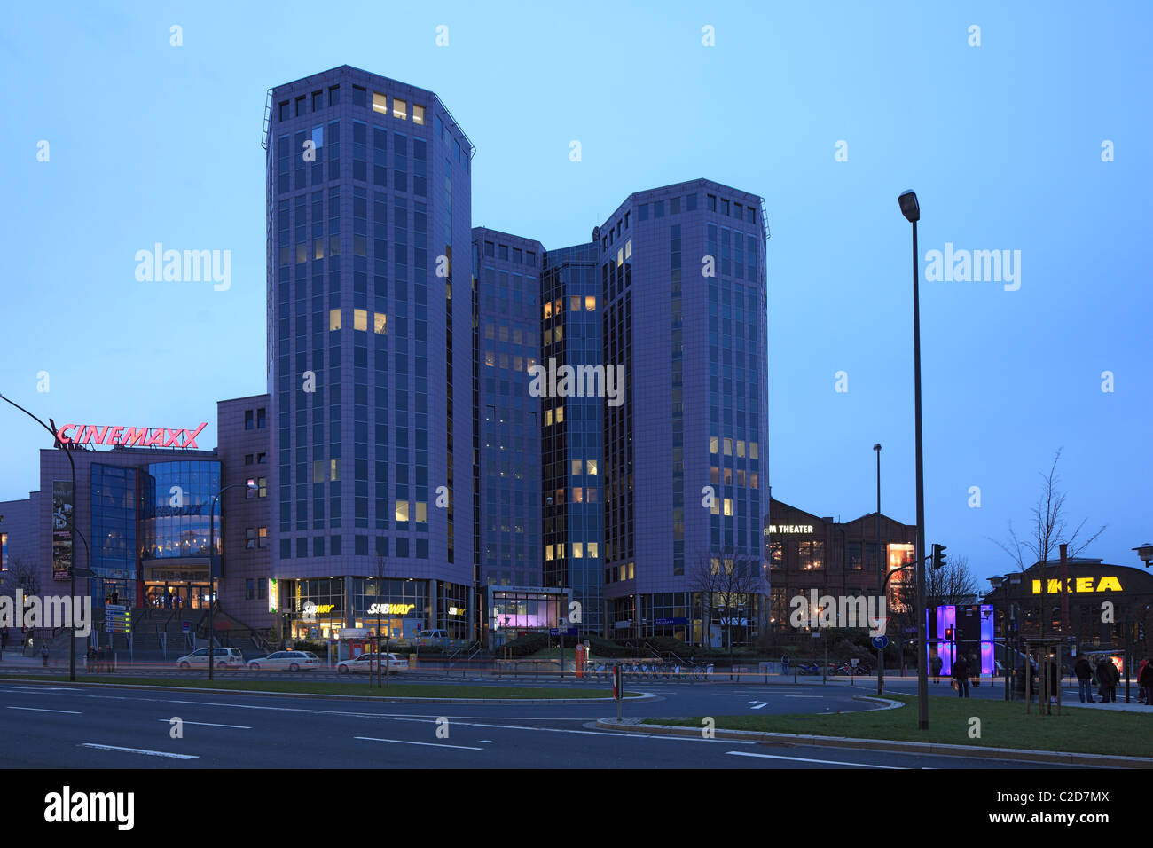 CinemaxxKino Und Buerohochhaeuser bin Abend, Beleuchtung, Berliner Platz in Essen, Ruhrgebiet