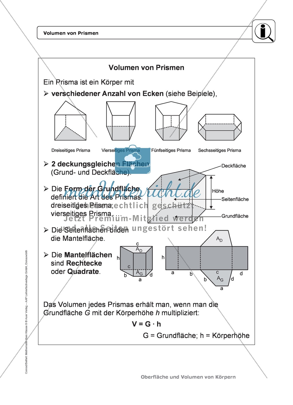 Körper Oberfläche und Volumen von Prismen Infotexte + differenzierte Aufgaben + Lösungen