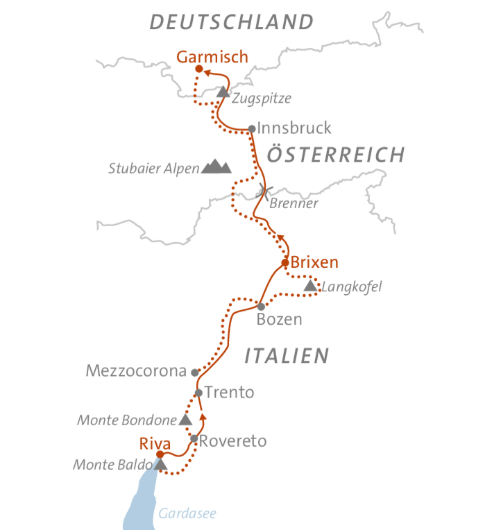 Montag Etappe 1 - Von Grainau nach Imst: ca. 50 km; ca. 850 hm. Dienstag Etappe 2 - Von Imst nach Nauders: ca. 80 km; ca. 1100 hm. Mittwoch Etappe 3 - Von Nauders nach Meran: ca. 100 km; ca. 300 hm. Donnerstag Etappe 4 - Von Meran nach Trento: ca. 100 km; ca. 600 hm. Freitag Etappe 5 - Von Trento an den Gardasee: ca. 50 km; ca. 250 hm.