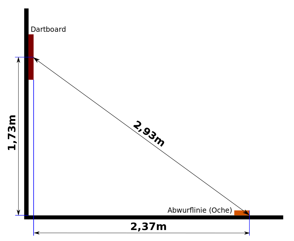 Die richtige Höhe bis zum Mittelpunkt der Dartscheibe, also dem Bull's Eye, ist 1,73 m über dem Boden. Der horizontale Abstand der Wurflinie (Oche) bis zur Scheibe beträgt 2,37 m. Das Diagonalmaß (Abstand vom Bull direkt zum Oche) beträgt 2,93 m. Seitlicher Abstand der Scheibenmitte zur Wand mindestens 0,90 m, zwischen zwei Scheiben.